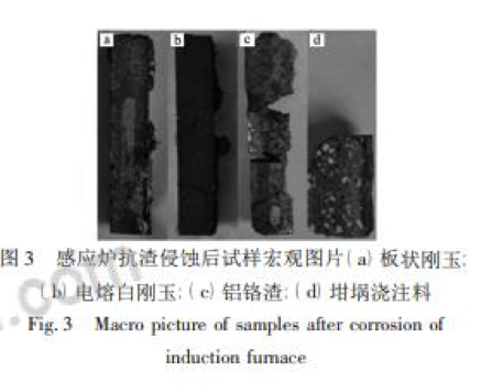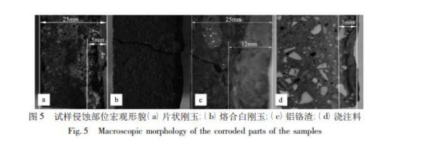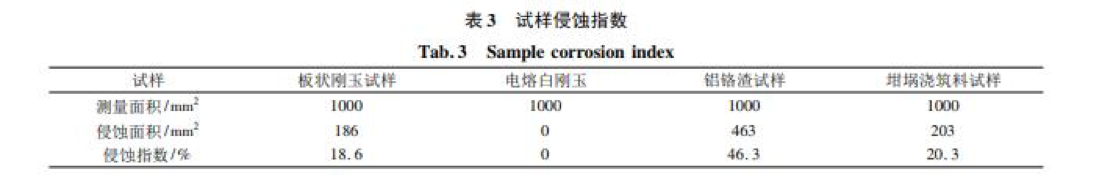 對上述四種中頻爐內襯試樣侵蝕部位進(jìn)行觀(guān)察如圖 5 所示。試樣寬度均為 25 mm,板狀剛玉試樣被侵蝕約 5 mm, 電熔白剛玉試樣未觀(guān)察到宏觀(guān)侵蝕,鋁鉻渣試樣被侵蝕約 12 mm,坩堝澆注料試樣被侵蝕約 5 mm,按公式 ( 1) 計算試樣侵蝕指數如表 3 所示。 侵蝕指數 R = 侵蝕面積 測量面積 × 100%