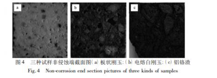 中頻爐動(dòng)態(tài)抗渣實(shí)驗后三種試樣和坩堝澆注料試 樣的宏觀(guān)圖片如圖 3 所示。坩堝澆注料是以板狀剛玉 和活性氧 化 鋁 為 骨 料、鉻 綠 為 細 粉、純 鋁 酸 鈣 水 泥 ( secar 71) 為結合劑制備的。在切割分離坩堝中鑲嵌的試樣的過(guò)程中,由于切割機的震動(dòng)對試樣產(chǎn)生剪切應力,導致試樣斷裂,試樣斷裂的程度與試樣的強度成正相關(guān)。在切割過(guò)程中板狀剛玉試樣未斷裂,僅在侵蝕處出現裂紋,并且圖 4 中板狀剛玉試樣的截面圖反映試樣基質(zhì)和骨料燒結良好,結構致密。電熔白剛玉試樣與板狀剛玉試樣相比裂紋較大,但是整體結構完整,其截面圖較板狀剛玉試樣基質(zhì)部分出現較多的大氣孔,可能是由于物料的級配和搗打工藝導致; 鋁鉻渣試樣基本已經(jīng)破碎,從破碎的斷口處可以看出,試樣內部的基質(zhì)處和骨料均具有較多的小氣孔,樣品結合性較弱,強度較低,導致切割過(guò)程中損毀嚴重。