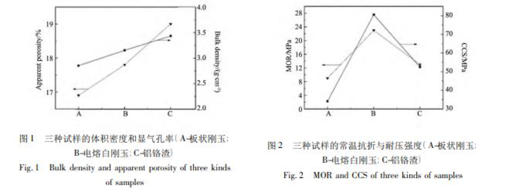 中頻爐內襯材料板狀剛玉、電熔白剛玉、鋁鉻渣三種試樣的體積密度、顯氣孔率、常溫抗折強度和常溫耐壓強度如圖 1、 圖 2 所示。由圖可知,板狀剛玉試樣顯氣孔率最小,鋁鉻渣顯氣孔率最大,但是板狀剛玉的體積密度小于鋁鉻渣的體積密度。電熔白剛玉的顯氣孔率和體積密度雖處于板狀剛玉和鋁鉻渣兩者之間,但電熔白剛玉試樣常溫抗折和耐壓強度最大。因此就中頻爐內襯材料綜合性能而言,電熔白剛玉試樣最佳。