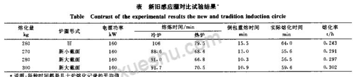 經(jīng)過(guò)更換中頻電爐感應圈,改接電容器,完成了電爐的改造。在清華大學(xué)機械廠(chǎng)沙河分廠(chǎng)進(jìn)行了新舊爐型的對比試驗。熔化材料為玲激合金鑄鐵,鐵水溫度1480℃。試驗結果見(jiàn)下表。